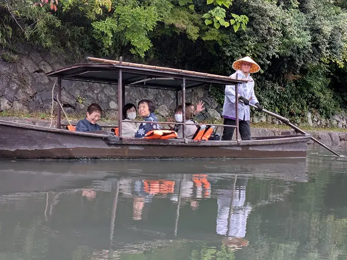 当日は雨模様でしたが、和船に乗る時には雨もやみ33名の方々が手漕ぎの和船に乗り、のんびりゆったり秋の八幡堀巡りをしました。過ごした時期は違いますが、『八幡商業高校の学び舎で学んだ』共通した思いが直ぐに心を一つにしてくれ、あらためて八幡商業高校を誇りに感じることが出来ました。